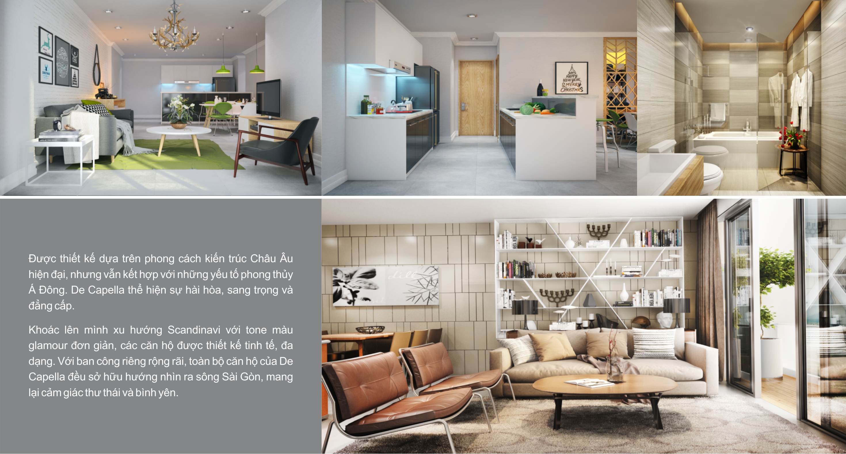 Thiết kế Scandinavia mang đậm phong cách Bắc Âu được biết đến với 3 điểm nổi bật: đơn giản trong thiết kế, tinh tế trong cảm giác và tiện nghi khi sử dụng. Với sự pha trộn một cách hoàn hảo của 3 đặc điểm này, căn hộ De Cappella sẽ đem đến cho bạn một không gian sống thật tiện nghi, thoải mái và đẳng cấp.